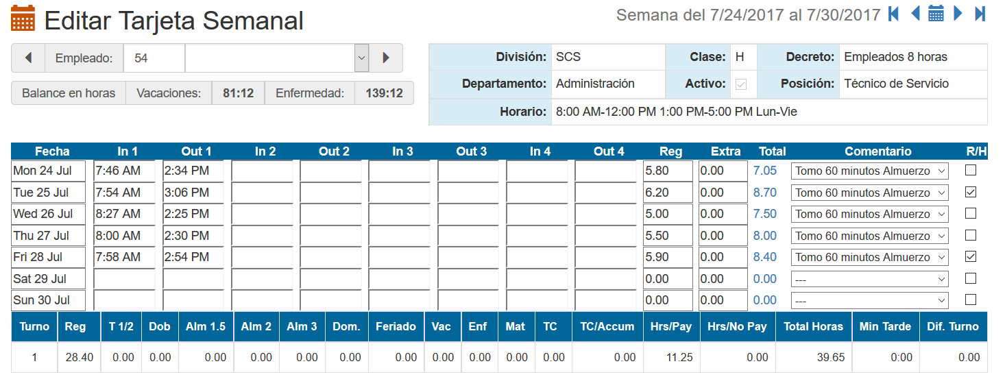 Easily manage daily punches, enter leave of absence information, comments and much more. Daily punches are transferred automatically into the time card. The system calculates hours and penalities according to rules set by user.